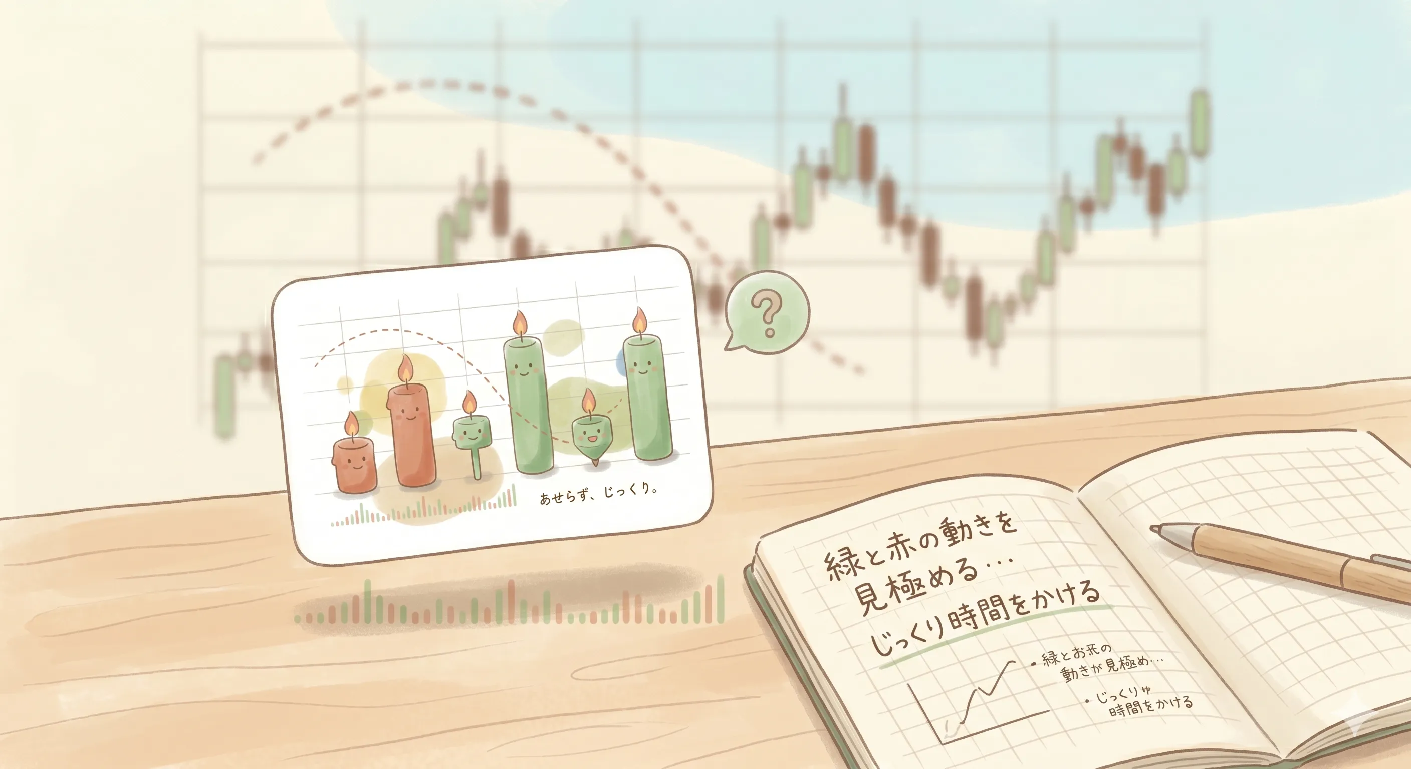 正解を急がなくて大丈夫です。まずは好奇心が少しずつ戻ってくるように、やさしい言葉と順番を大切にしたいと思っています。 用語はゆっくり、図は少しずつ。ご自身のペースで、相場の見え方を少しずつ整えていきましょう。